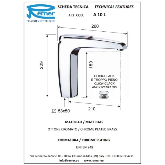 Смеситель для раковины Remer Qubika Q10L с донным клапаном, хром