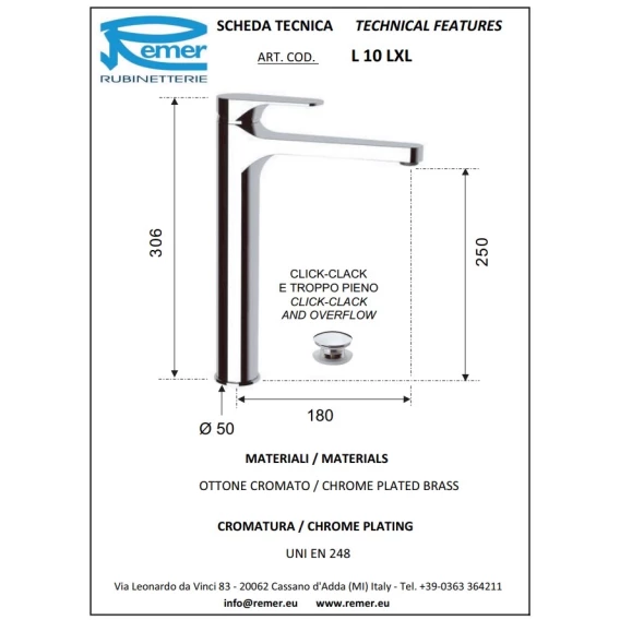 Смеситель для раковины Remer Class Line L10LXL с донным клапаном, хром
