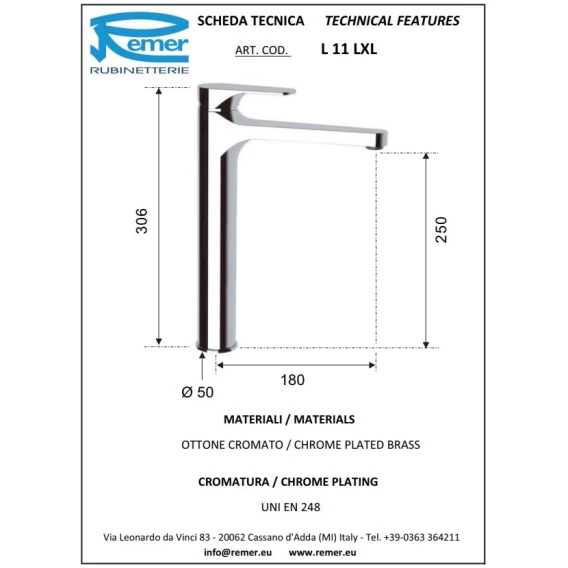 Смеситель для раковины Remer Class Line L11LXL без донного клапана, хром