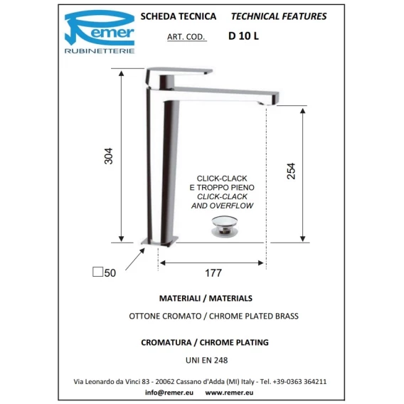 Смеситель для раковины Remer Dream D10L с донным клапаном, хром