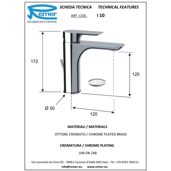 Смеситель для раковины Remer Infinity I10 с донным клапаном, хром