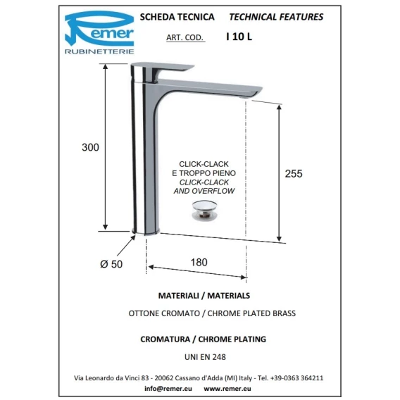 Смеситель для раковины Remer Infinity I10L с донным клапаном, хром