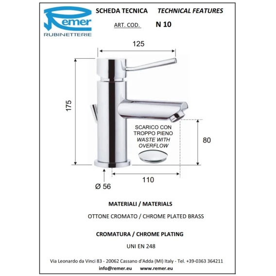 Смеситель для раковины Remer Minimal N10 с донным клапаном, хром