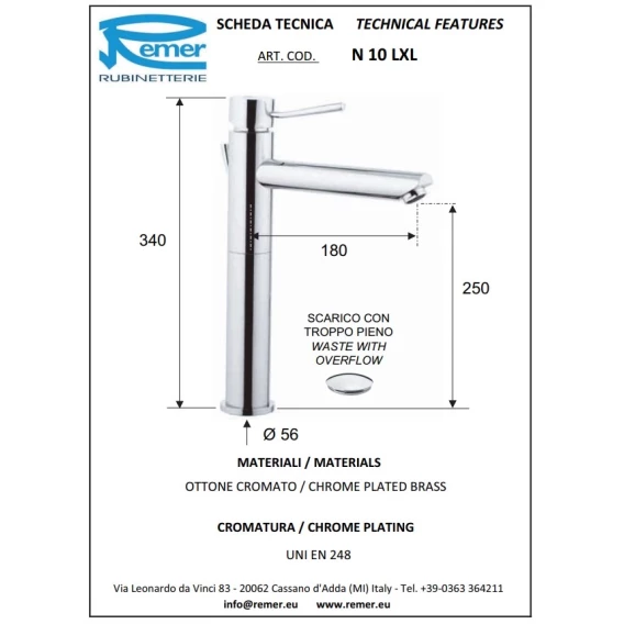 Смеситель для раковины Remer Minimal N10LXL с донным клапаном, хром