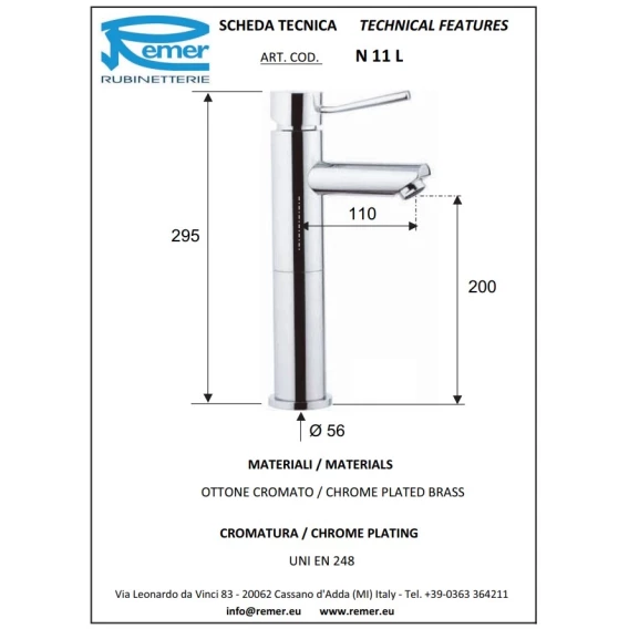Смеситель для раковины Remer Minimal N11L без донного клапана, хром