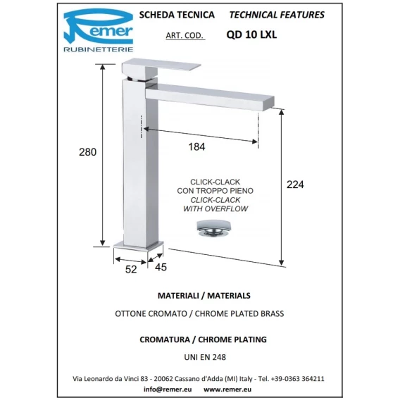 Смеситель для раковины Remer Q-Design QD10LXL с донным клапаном, хром