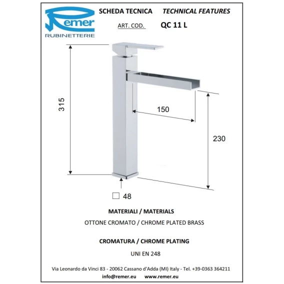 Смеситель для раковины Remer Qubika Cascata QC11L без донного клапана, хром