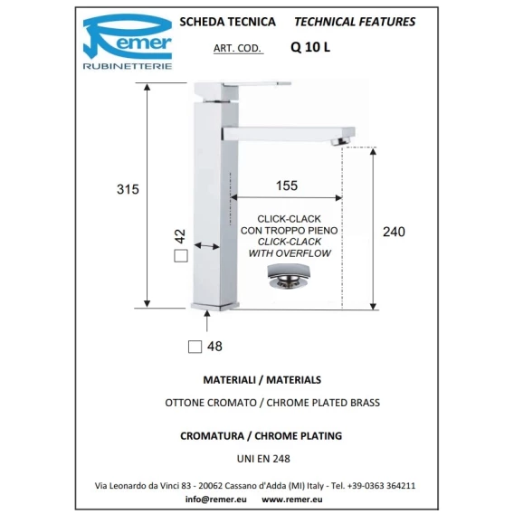 Смеситель для раковины Remer Qubika Q10L с донным клапаном, хром