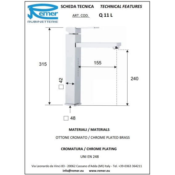 Смеситель для раковины Remer Qubika Q11L без донного клапана, хром