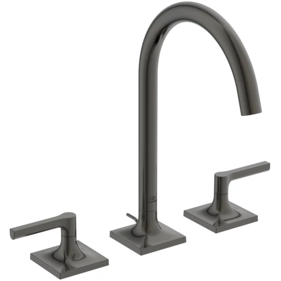 JOY NEO Двурукоятковый смеситель для раковины под 3 отверстия, с донным клапаном, 5 л/мин. Металлические квадратные декоративные накладки, трубчатый излив с логотипом Ideal Standard, металлические рукоятки lever без индикаторов горячей / холодной воды, аэратор Caché M16,5x1 с ограничением потока 5 л/мин, керамические кранбуксы, гибкая подводка PEX G3/8", металлический донный клапан Magnetic Grey (Магнит)