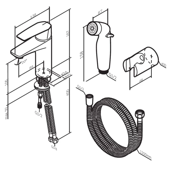 Крепление, Аэратор, Гибкая подводка, Душевой шланг, Душевая лейка, Держатель для душевой лейки