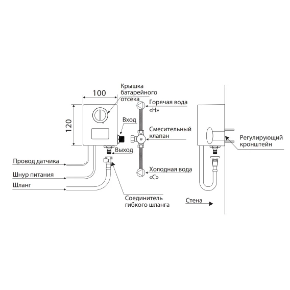 Смеситель начнет и прекратит работу автоматически с максимальной продолжительностью потока 60 секунд, скорость потока воды – 8,5 л/мин.Смеситель может работать от напряжения сети 220 В 50 Гц (модель переменного тока) или щелочных батареек 4×1,5 В AA (модель постоянного тока).