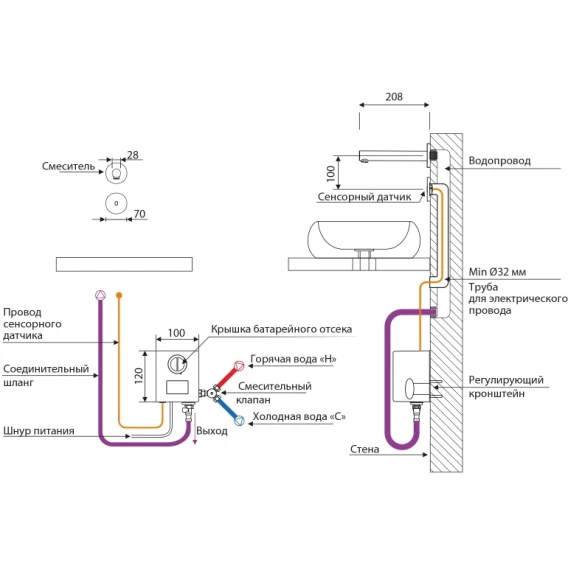 • Смеситель может работать от напряжения сети 220 В 50 Гц (модель переменного тока) или щелочных батареек 4×1,5 В AA (модель постоянного тока).