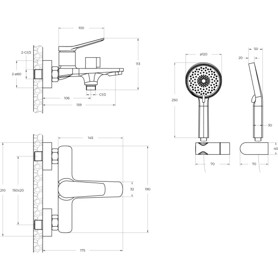 Аэратор, Металлическая розетка, Эксцентрики, Душевой шланг, Душевая лейка, Держатель для душевой лейки