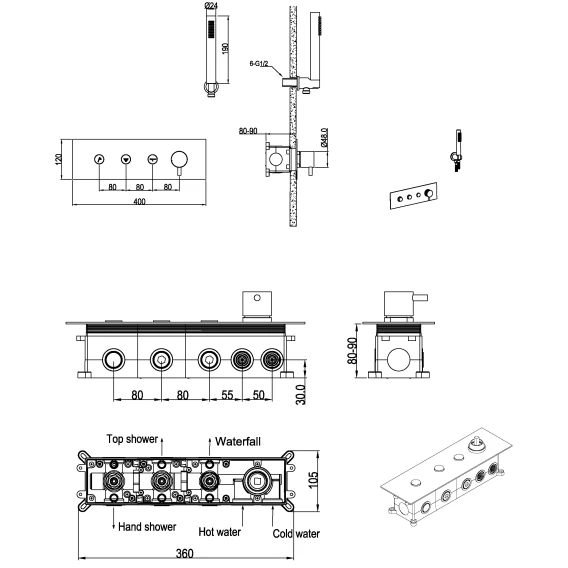 Душевой шланг, Душевая лейка, Подключение для душевого шланга с держателем, Скрытая монтажная часть