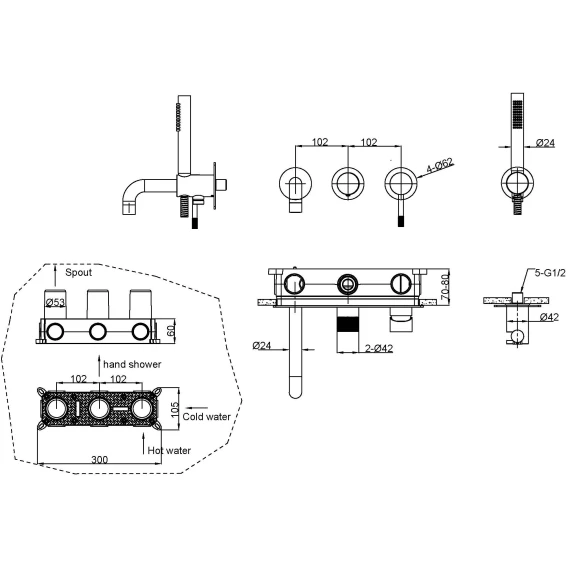 Аэратор, Душевой шланг, Душевая лейка, Подключение для душевого шланга с держателем, Излив, Скрытая монтажная часть