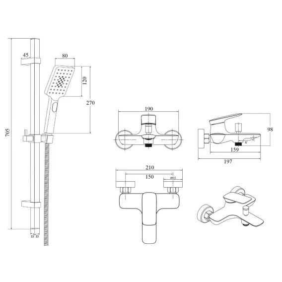 Крепление, Аэратор, Металлическая розетка, Эксцентрики, Душевой шланг, Душевая лейка, Держатель для душевой лейки, Штанга душевая