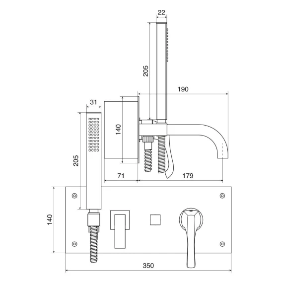 Аэратор, Душевой шланг, Душевая лейка, Подключение для душевого шланга с держателем, Излив, Скрытая монтажная часть