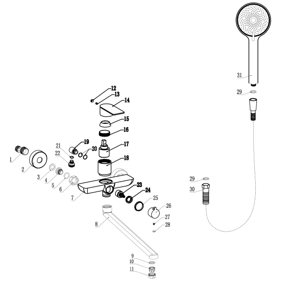 Аэратор, Металлическая розетка, Эксцентрики, Душевой шланг, Душевая лейка, Держатель для душевой лейки