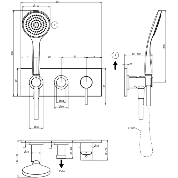 Душевой шланг, Душевая лейка, Подключение для душевого шланга с держателем