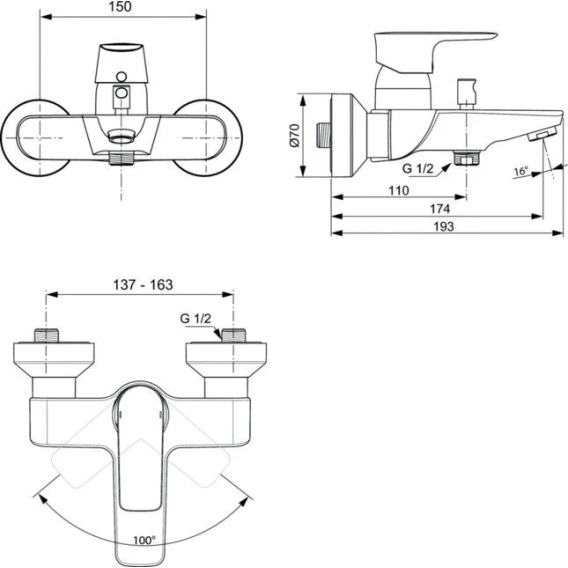 CONNECT AIR Настенный смеситель для ванны/душа, керамический картридж IS 40 мм с функцией HWTC (ограничение максимальной температуры горячей воды), с функцией CLICK (ограничение потока воды), монтаж на стандартных эксцентриках (в комплекте: эксцентрики, пластиковые отражатели, уплотнительные прокладки)