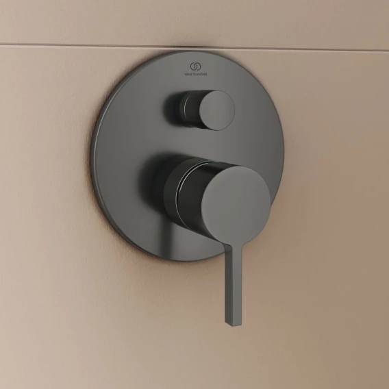 A7383A5 JOY Встраиваемый смеситель для ванны/душа, комплект №2 (внешняя часть), керамический картридж 47 мм, с функцией HWTC (ограничение максимальной температуры горячей воды), круглая плоская металлическая накладка с логотипом Ideal Standard, металлическая рукоятка без индикаторов горячей / холодной воды, автоматическое переключение, для монтажа с комплектом EASY-BOX A1000NU (встраиваемая часть)
