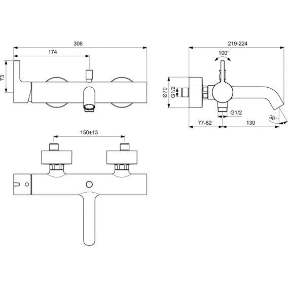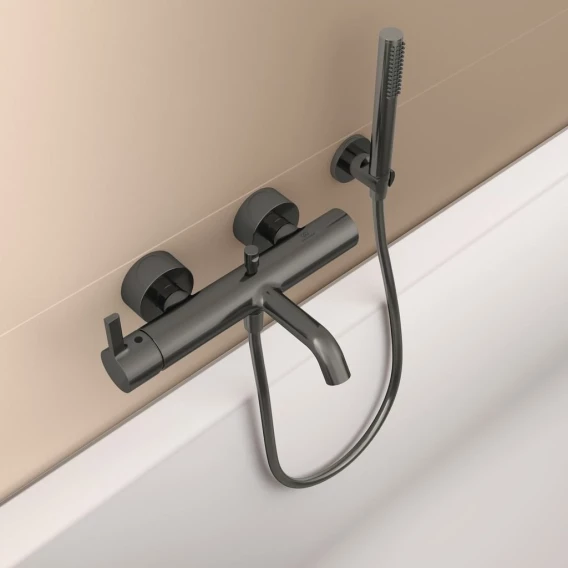 BC786A5 JOY Настенный смеситель для ванны/душа,керамический картридж FirmaFlow 38 мм, с функцией HWTC (ограничение максимальной температуры горячей воды), без функции CLICK,логотип Ideal Standard на корпусе, металлическая рукоятка без индикаторов горячей / холодной воды,обратный клапан, эксцентрики с шумопонижателем,аэратор Caché M24x1,автоматическое переключение