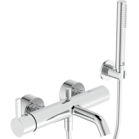 BC787AA JOY Смеситель настенный для ванны с душевым комплектомметаллический ручной душ типа Stick, с логотипом Ideal Standard, шланг IdealFlex 1600 мм, цилиндрический держатель для душакерамический картридж FirmaFlow 38 мм, с функцией HWTC (ограничение максимальной температуры горячей воды), без функции CLICK,логотип Ideal Standard на корпусе, металлическая рукоятка без индикаторов горячей / холодной воды, обратный клапан, эксцентрики с шумопонижателем,аэратор Caché M24x1,автоматическое переключение