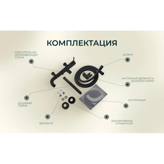 Аэратор, Металлическая розетка, Эксцентрики, Душевой шланг, Душевая лейка, Держатель для душевой лейки