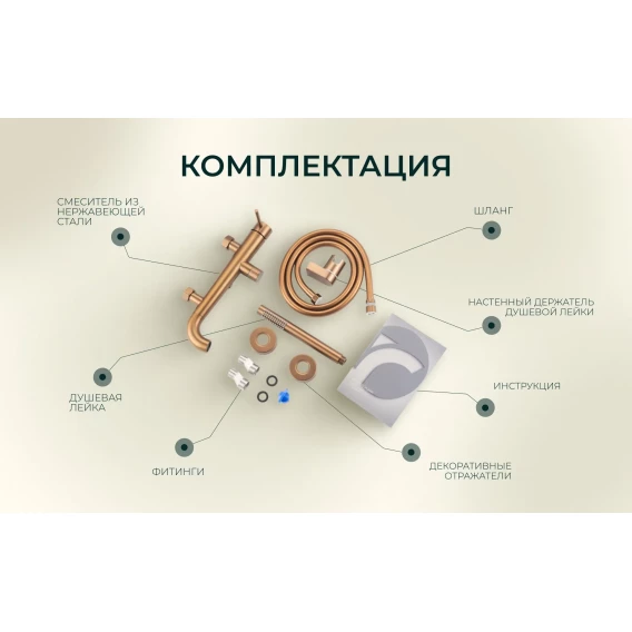 Аэратор, Металлическая розетка, Эксцентрики, Душевой шланг, Душевая лейка, Держатель для душевой лейки