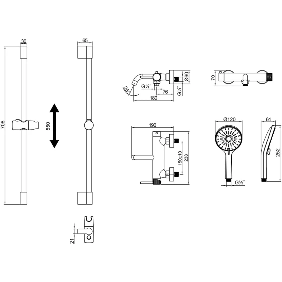 Крепление, Аэратор, Металлическая розетка, Эксцентрики, Душевой шланг, Душевая лейка, Держатель для душевой лейки, Штанга душевая