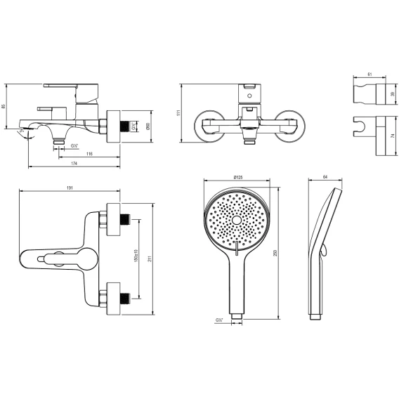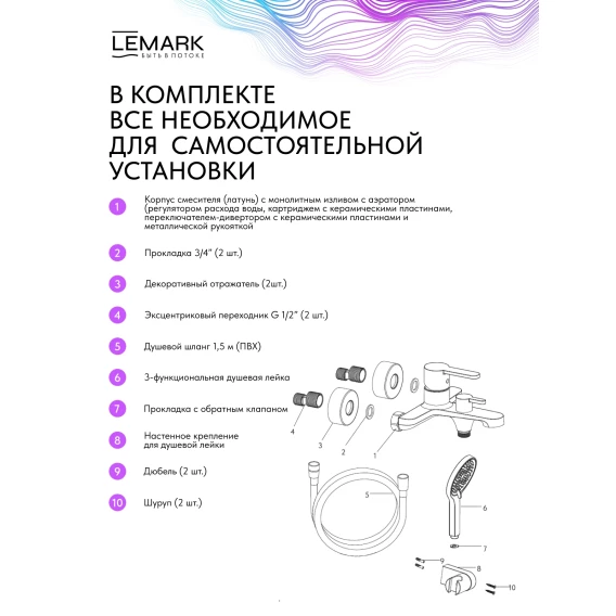 Аэратор, Металлическая розетка, Эксцентрики, Душевой шланг, Душевая лейка, Держатель для душевой лейки