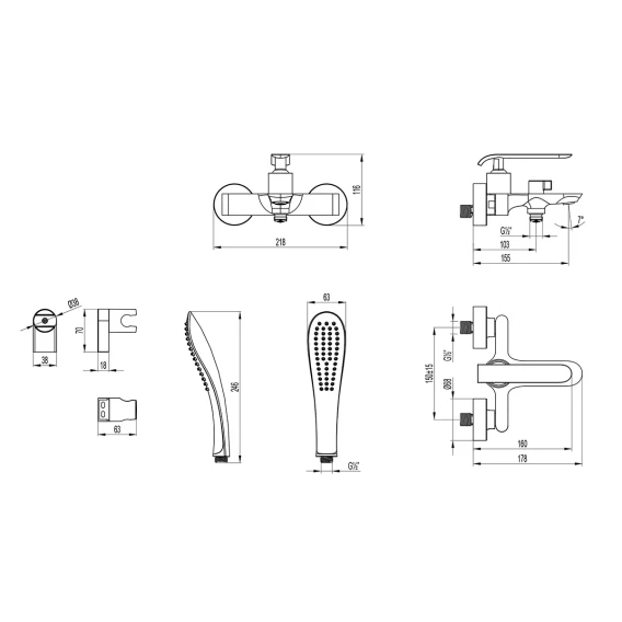 Аэратор, Металлическая розетка, Эксцентрики, Душевой шланг, Душевая лейка, Держатель для душевой лейки