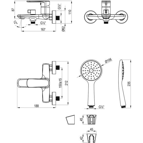 Аэратор, Металлическая розетка, Эксцентрики, Душевой шланг, Душевая лейка, Держатель для душевой лейки