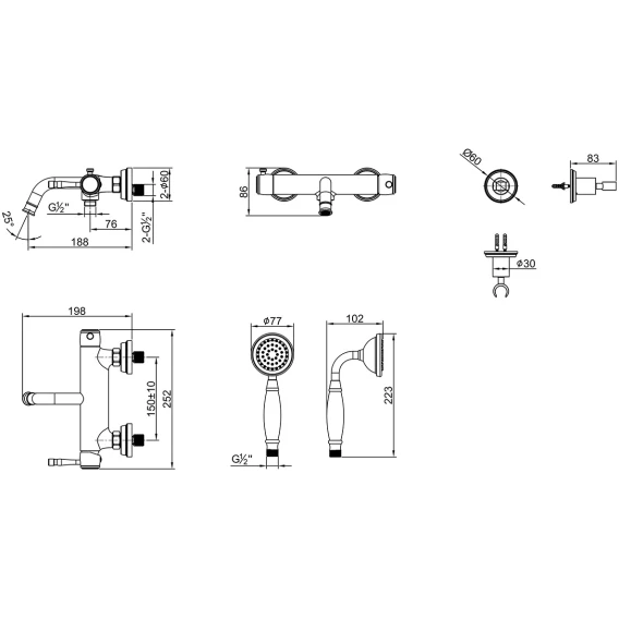 Аэратор, Металлическая розетка, Эксцентрики, Душевой шланг, Душевая лейка, Держатель для душевой лейки