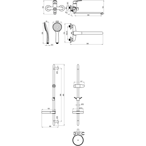 Крепление, Аэратор, Металлическая розетка, Эксцентрики, Душевой шланг, Душевая лейка, Держатель для душевой лейки, Мыльница, Штанга душевая