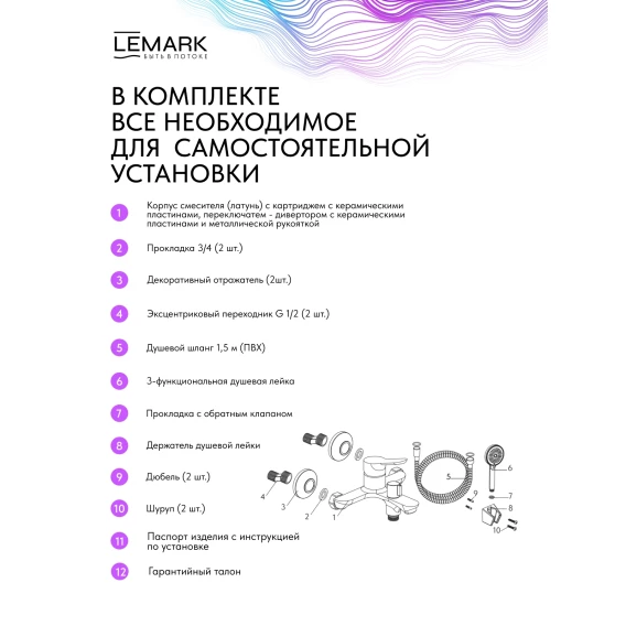 Аэратор, Металлическая розетка, Эксцентрики, Душевой шланг, Душевая лейка, Держатель для душевой лейки
