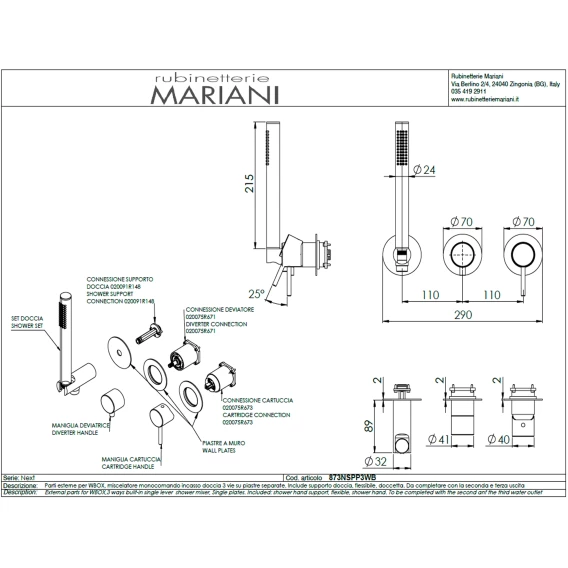 Смеситель для ванны Mariani Next B37873NSPP3WB встраиваемый, с душевым гарнитуром, белый матовый