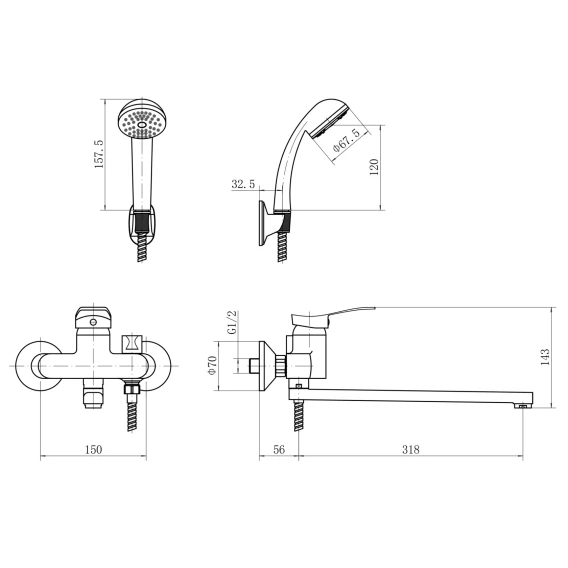 Аэратор, Металлическая розетка, Эксцентрики, Душевой шланг, Душевая лейка, Держатель для душевой лейки