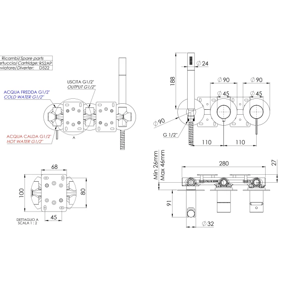 Душевой шланг, Душевая лейка, Подключение для душевого шланга с держателем, Скрытая монтажная часть