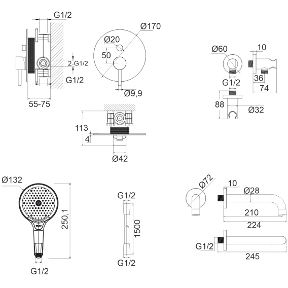 Аэратор, Душевой шланг, Душевая лейка, Подключение для душевого шланга с держателем, Излив, Скрытая монтажная часть
