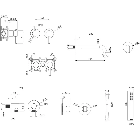 Аэратор, Душевой шланг, Душевая лейка, Держатель для душевой лейки, Подключение для душевого шланга, Излив, Скрытая монтажная часть