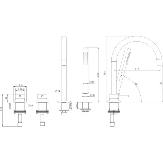 Крепление, Аэратор, Гибкая подводка, Душевой шланг, Душевая лейка