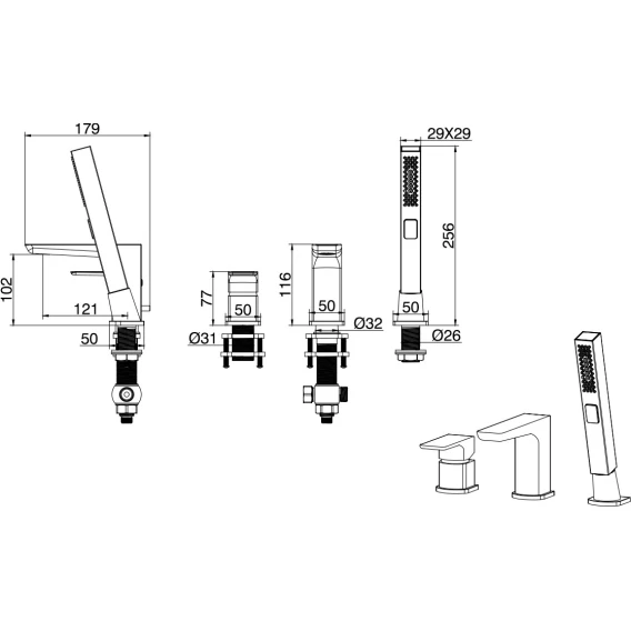 Крепление, Аэратор, Гибкая подводка, Душевой шланг, Душевая лейка