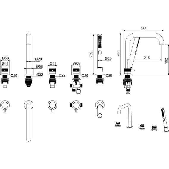 Крепление, Аэратор, Гибкая подводка, Душевой шланг, Душевая лейка
