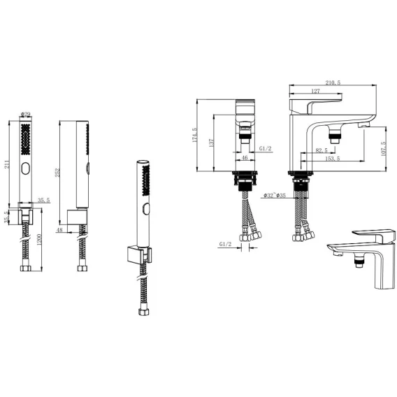Аэратор, Гибкая подводка, Душевой шланг, Душевая лейка, Держатель для душевой лейки