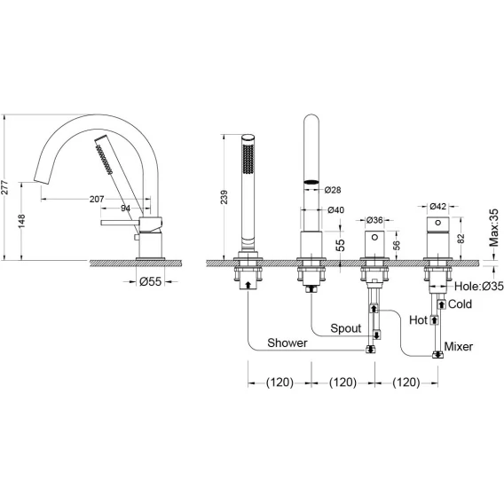Аэратор, Гибкая подводка, Душевой шланг, Душевая лейка