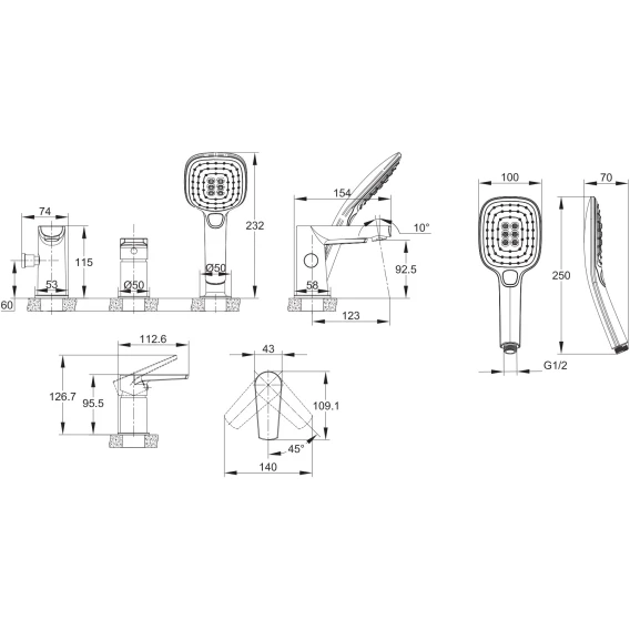 Крепление, Аэратор, Гибкая подводка, Душевой шланг, Душевая лейка