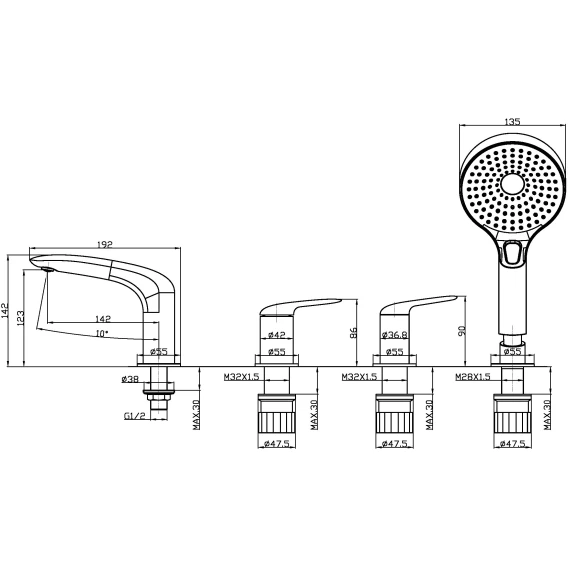 Смеситель на борт ванны Cezares Metauro METAURO-BVD4-01 с душевым гарнитуром, хром