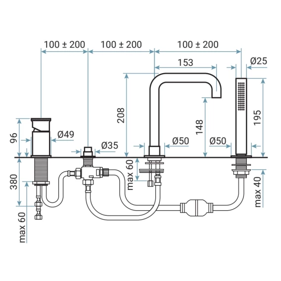 Крепление, Аэратор, Гибкая подводка, Душевой шланг, Душевая лейка